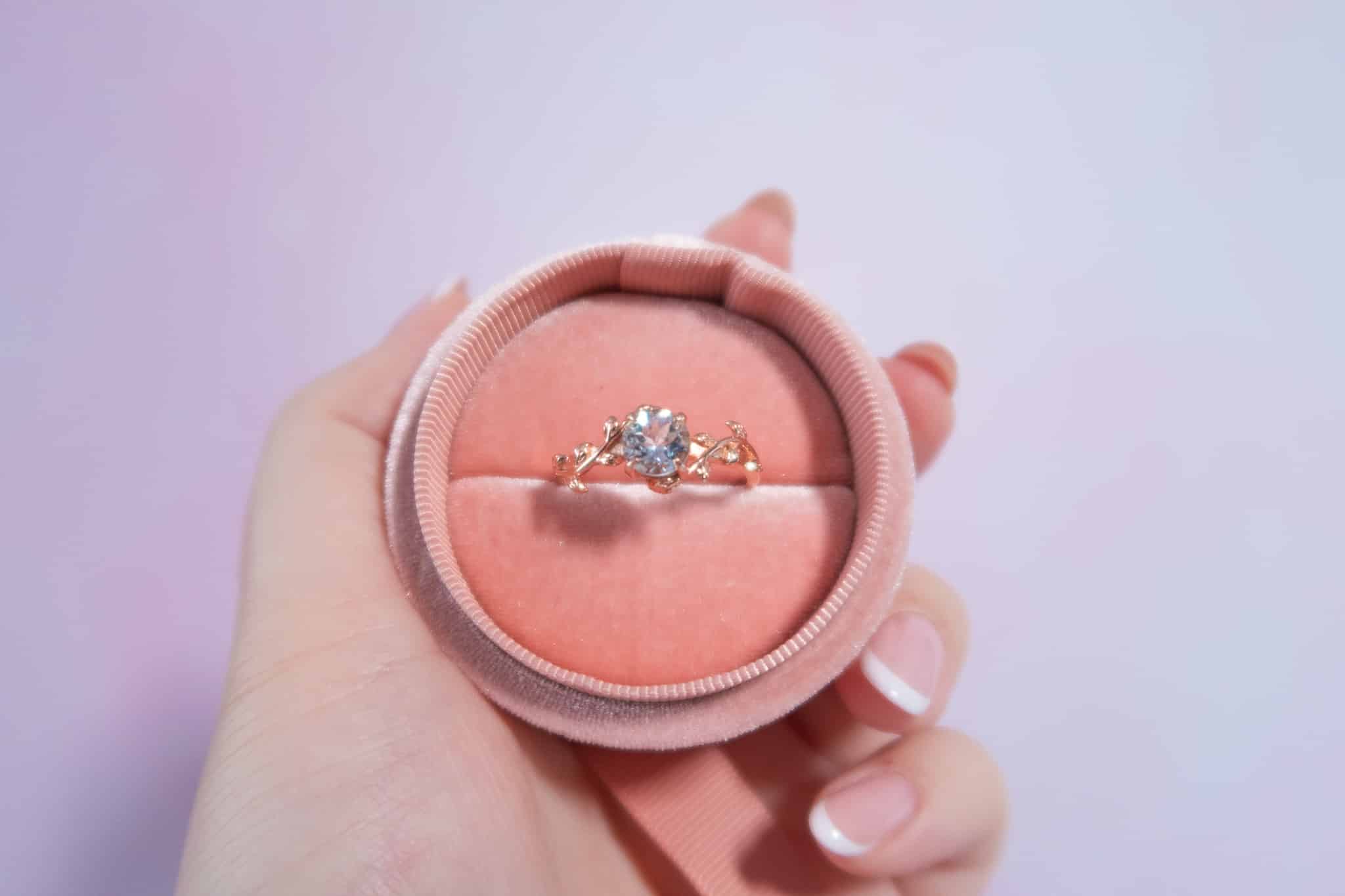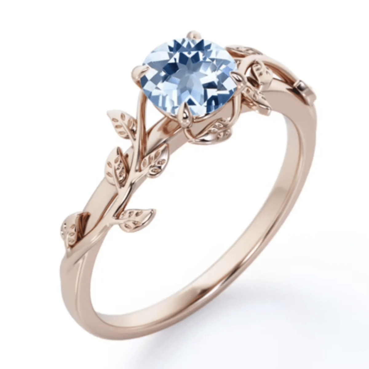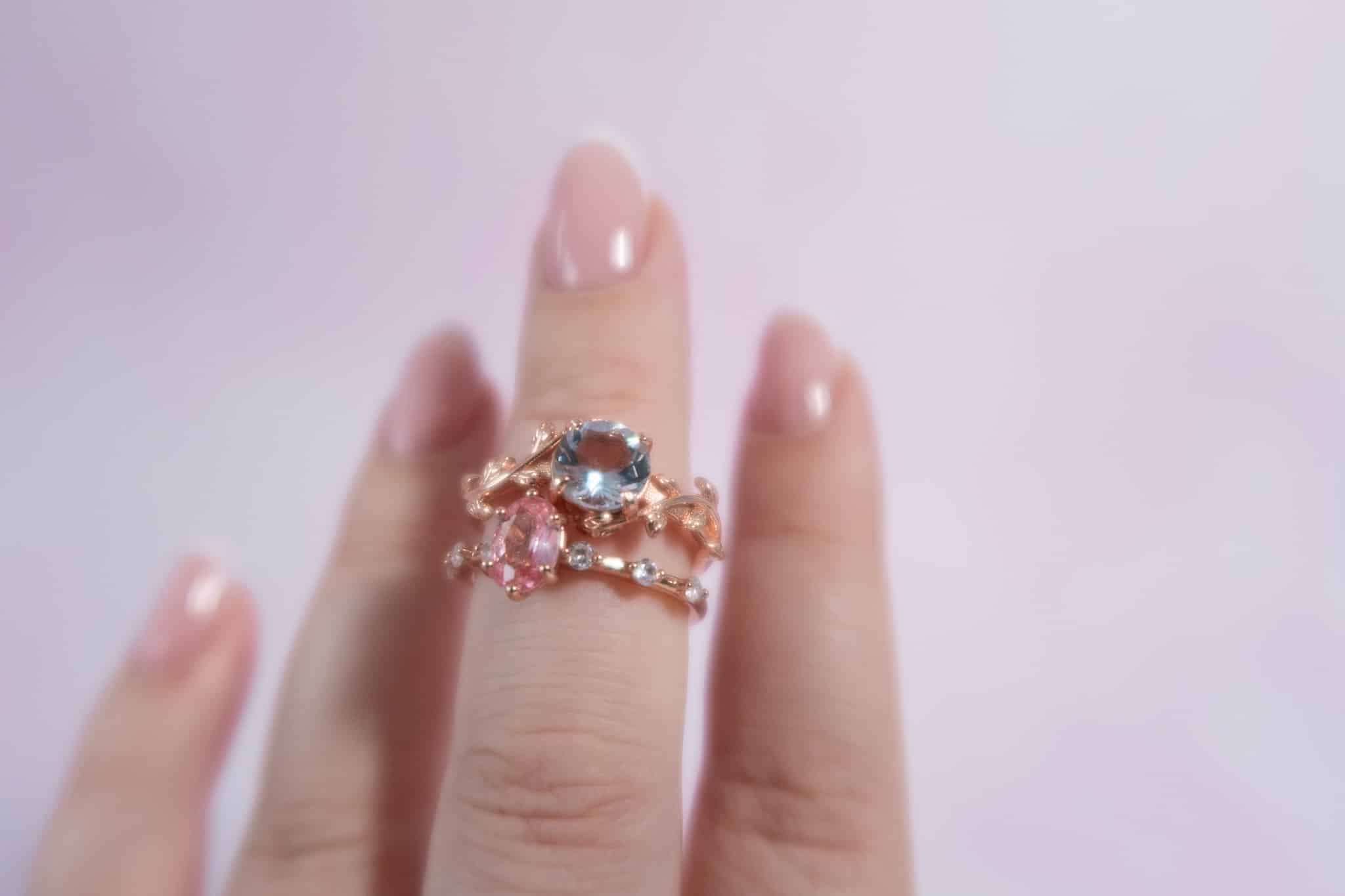 Centralnym punktem tego modelu jest akwamaryn- kamień o jasnoniebieskim odcieniu, kojarzony z harmonią, spokojem i przejrzystością. Jego naturalny, chłodny blask w połączeniu z różowym złotem tworzy niezwykle kobiecą, zmysłową kompozycję.